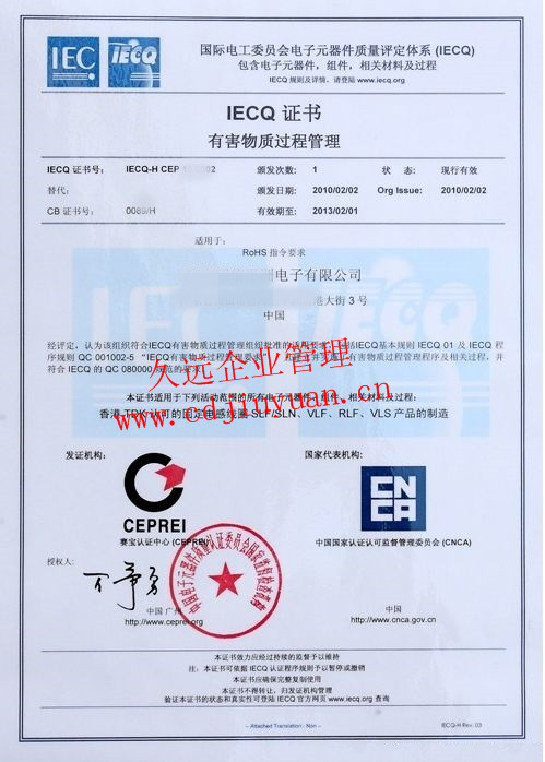 有害物質(zhì)過程管理體系認(rèn)證證書