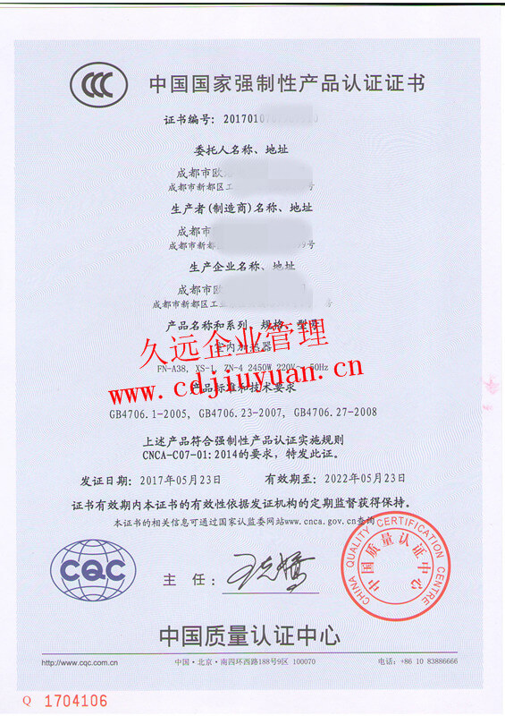 CQC標(biāo)志產(chǎn)品認(rèn)證證書